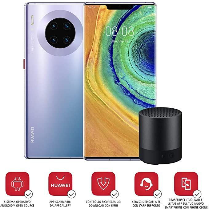 ๐HUAWEI Mate 30 Pro Smartphone e Mini Bluetooth Speaker CM55, Quadrupla fotocamera 40+40+8 MP e Sensore TOF 3D, Huawei Mobile Services (HMS), [Italia], Space Silver
