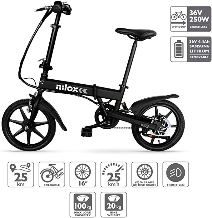 👁️🗨️🔝Nilox Doc X2, Bicicletta Elettrica, E-bike, Pedalata Assistita, Pieghevole, Ruota 16”, Motore 36V/250 W, Velocità max 25 Km/h, Nero