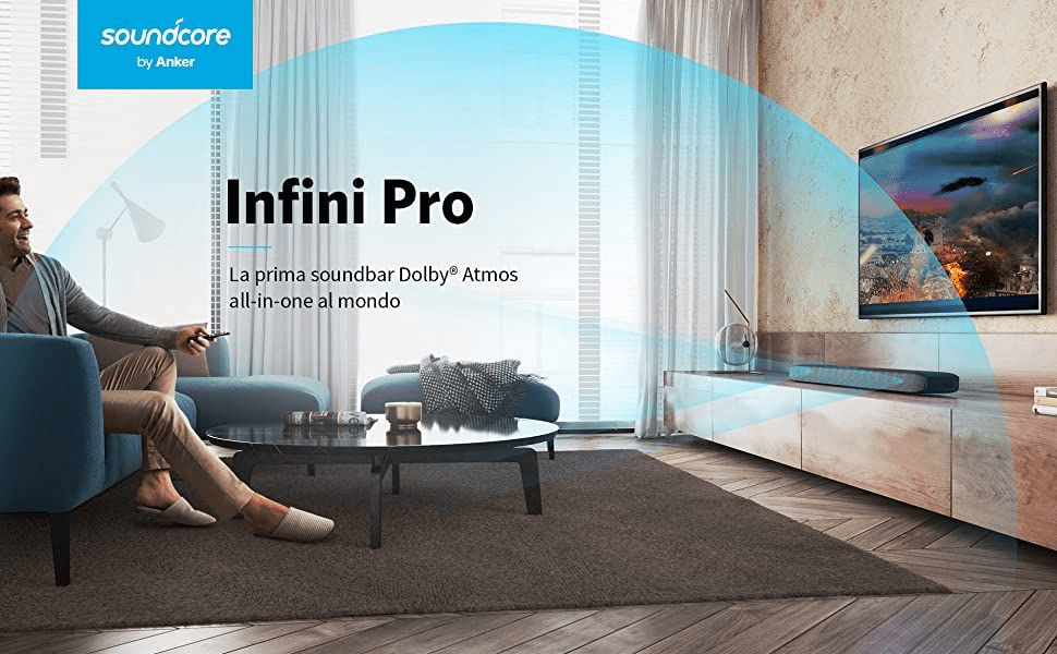 🔝👁️🗨️ Soundcore Infini Pro con Dolby Atmos e subwoofer incorporati, impianto TV surround con pass-through HDR a 4K, HDMI ARC e streaming musicale wireless con Bluetooth 5