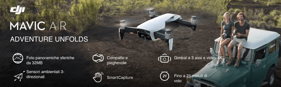 DJI Mavic Air – Drone con camera stabilizzata a 3 assi Video 4K Full-HD, Immagini panoramiche sferiche da 32 Megapixel e raggio di trasmissione fino a 4 km, pieghevole – Funzioni di volo inteligente, sensori 3 direzionali, – Nero