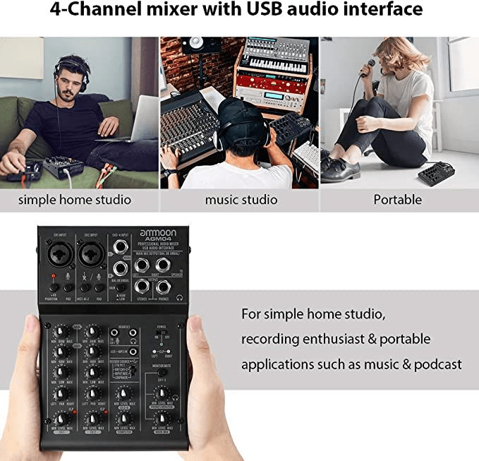 👁️🗨️ammoon Mini Consolle Mixer 4 Canali Mixer Audio Digitale EQ 2 Bande Integrato con Alimentazione Phantom 48V e USB 5V